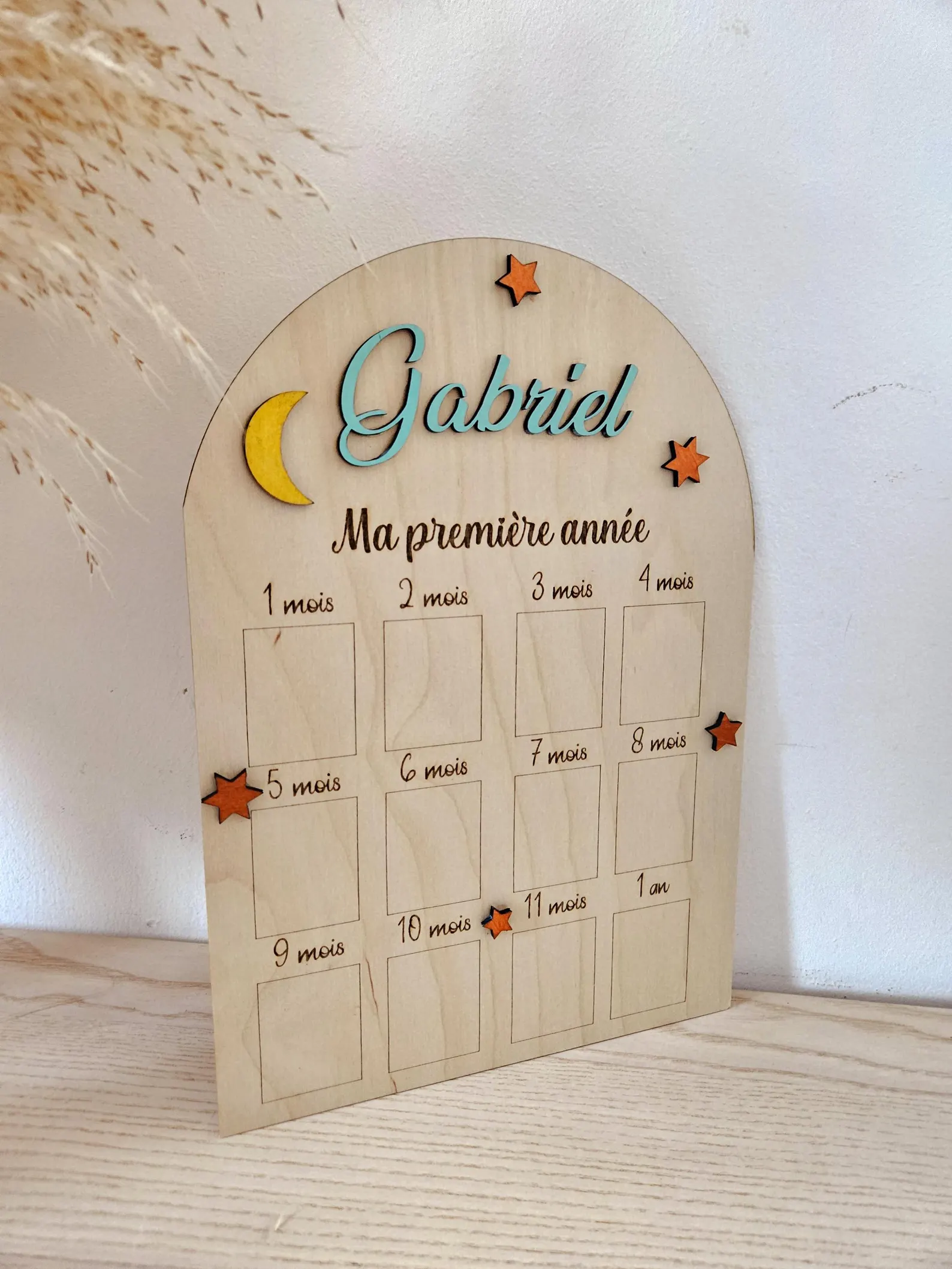 Ce panneau en bois est l'élément parfait pour conserver les photos de votre bébé tout au long de sa première année. Que ce soit pour un anniversaire, un baptême ou simplement pour décorer la chambre de votre enfant, il ajoutera une touche chaleureuse et personnelle à votre décoration.