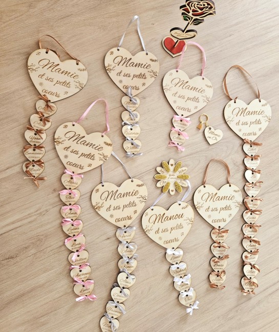 Offrez un cadeau unique et rempli d’amour avec "Les petits cœurs de Mamie" ou "Les petits cœurs de Maman". Cette création artisanale en bois de peuplier est idéale pour célébrer la fête des grands-mères ou la fête des mères.