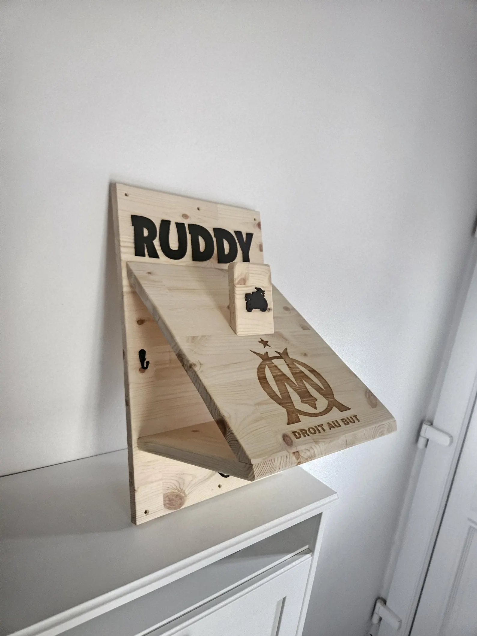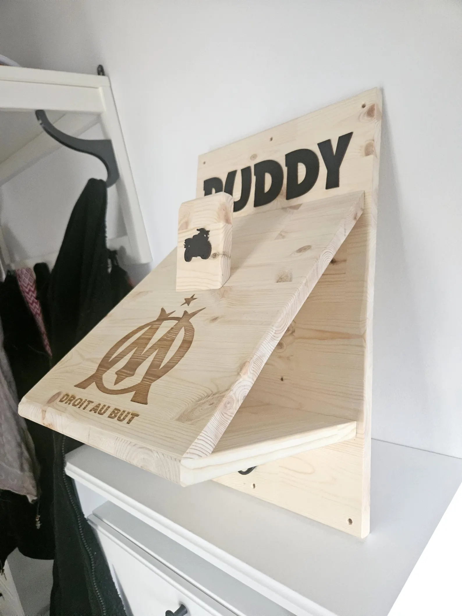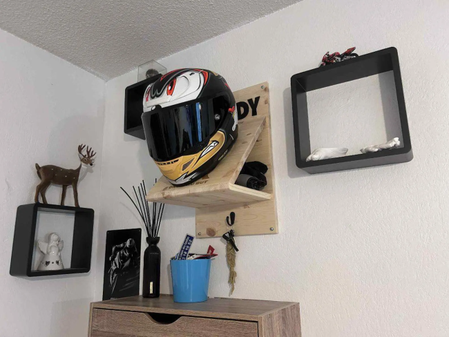 Offrez (ou offrez-vous) un support de casque moto unique, fabriqué à la main en bois de hêtre ou de sapin selon les arrivages.