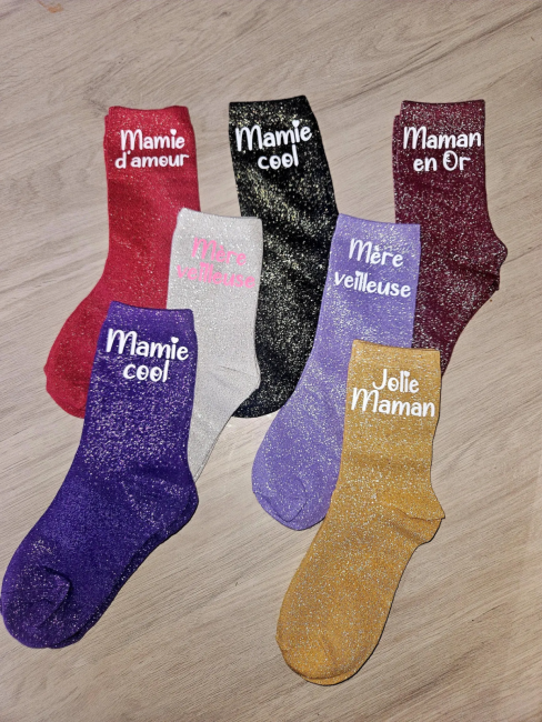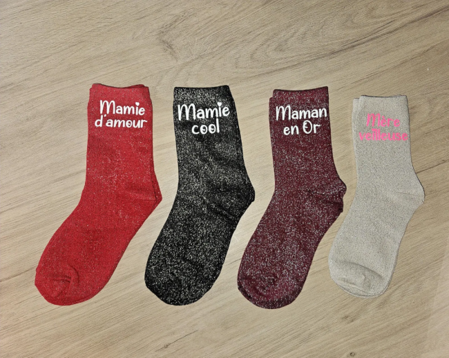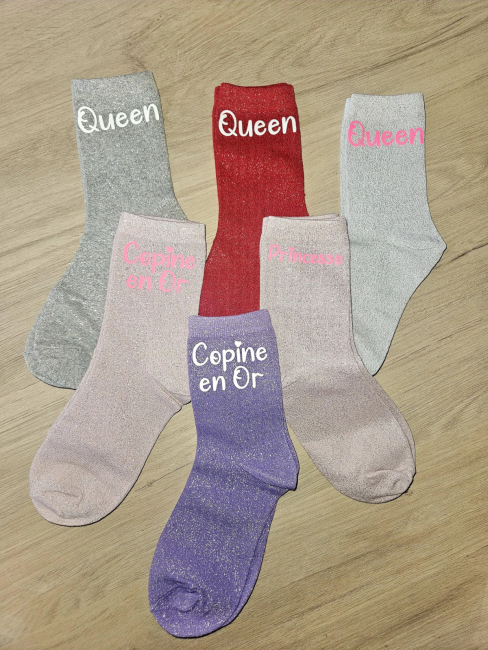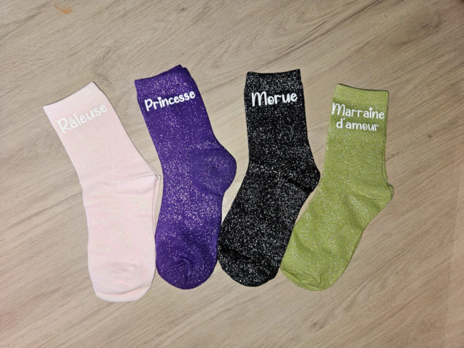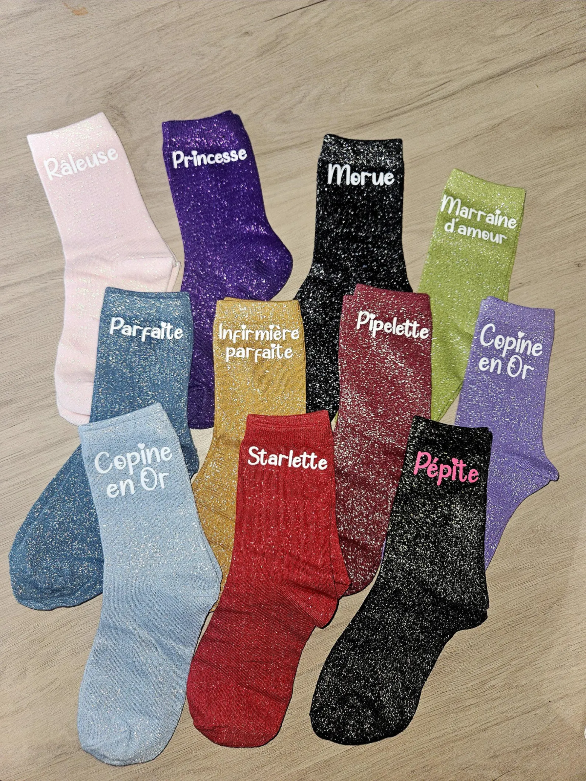 Ajoutez une dose de fun et d’humour à votre garde-robe avec nos chaussettes pailletées personnalisées ! Idéales pour celles qui aiment allier style et originalité, ces chaussettes sont une manière parfaite de mettre un peu de paillettes dans votre quotidien. Avec des messages pleins de caractère comme "Connasse", "Morue", "Ma caille", "Boudeuse", "Boucan", ou "Princesse", elles feront sourire à coup sûr et ajouteront une touche d'humour à votre look.