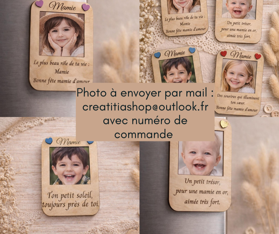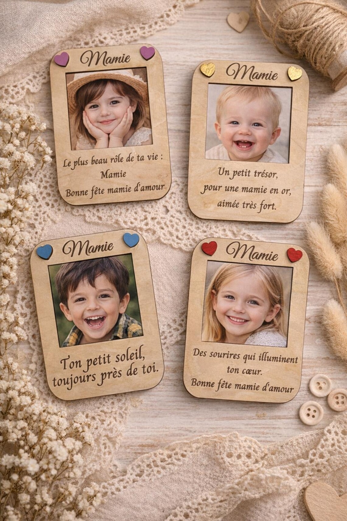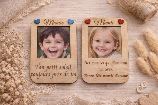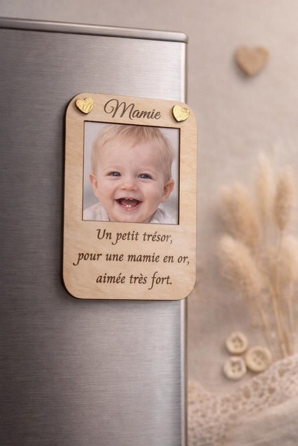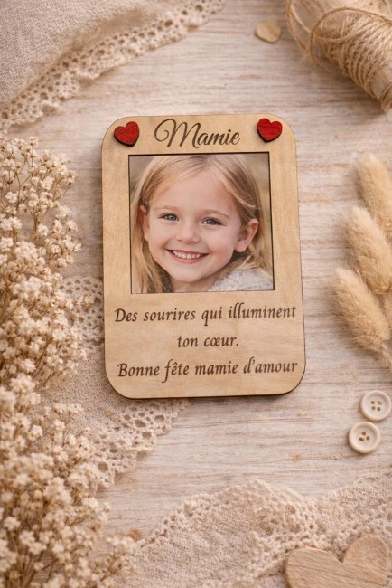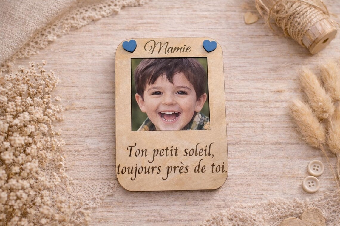 Ce magnet en bois personnalisé est décoré avec la photo de son petit-enfant et un texte au choix, pour un cadeau émouvant qu’elle pourra garder chaque jour sous les yeux.