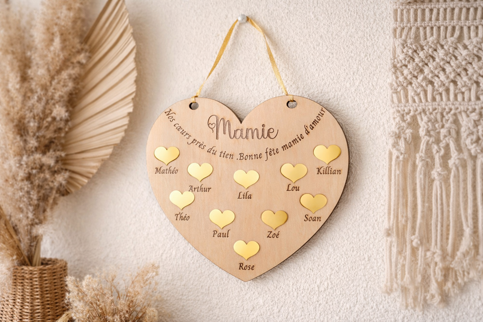 Ce cœur en bois personnalisé est gravé avec les prénoms des petits-enfants, chacun accompagné d’un petit cœur doré, symbole du lien unique entre une mamie et ses trésors.